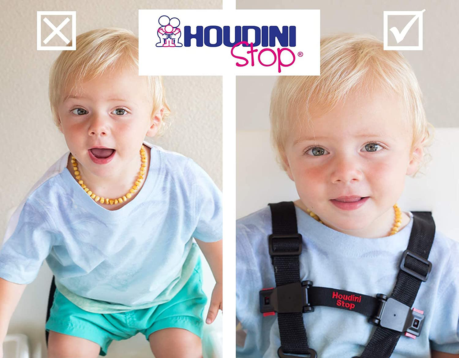 - KEEP YOUR SON, DAUGHTER OR GRANDCHILD SAFE & SECURE - Don't risk a fall or other avoidable injury before you stop this dangerous habit in it's tracks with the Houdini Stop. Use it as a car seat chest clip, high chair strap lock on your high chair or as a replacement strap set for your stroller.